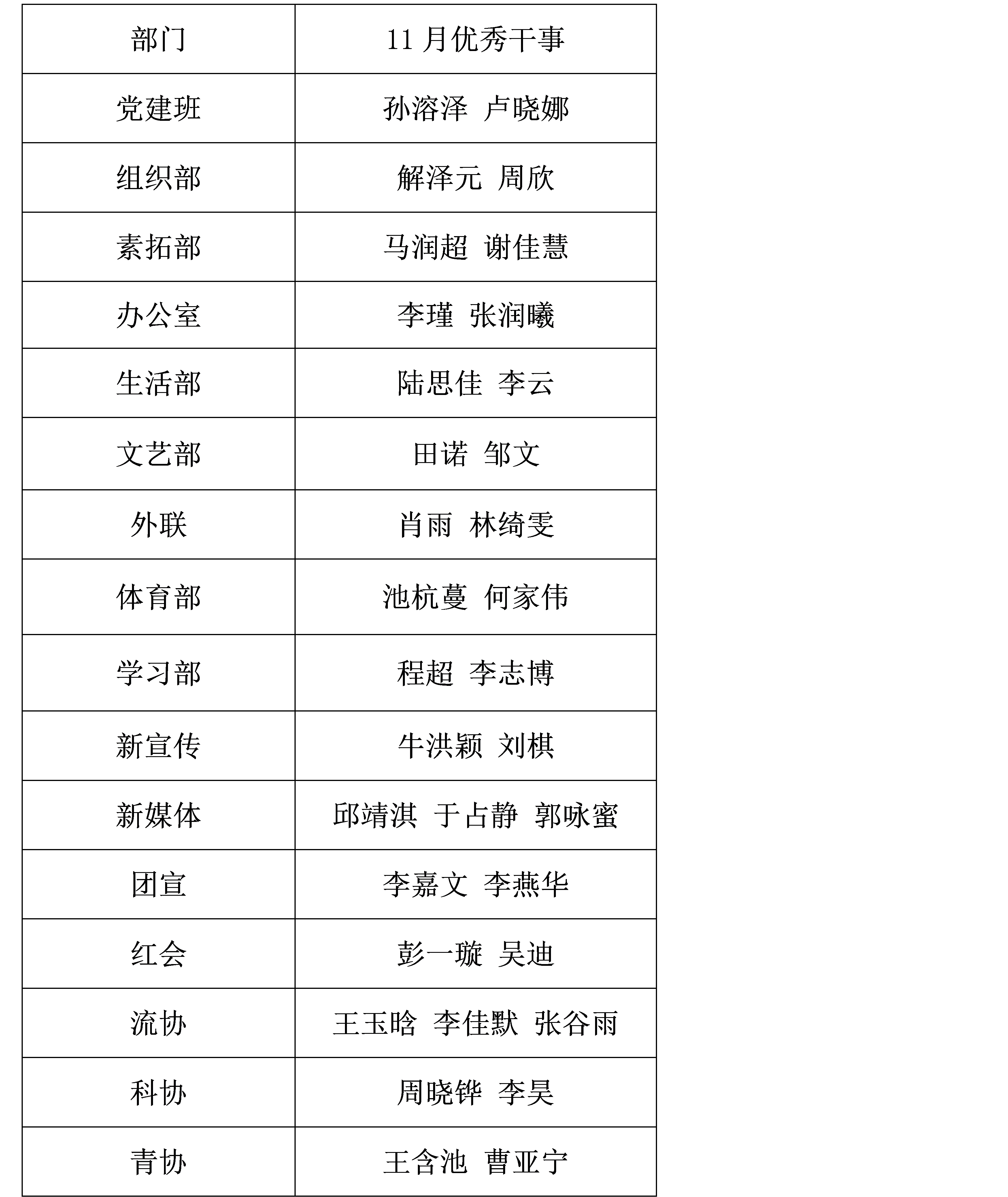 【学生工作】第37届党建班、团委学生会各部门11月优秀干事名单公示