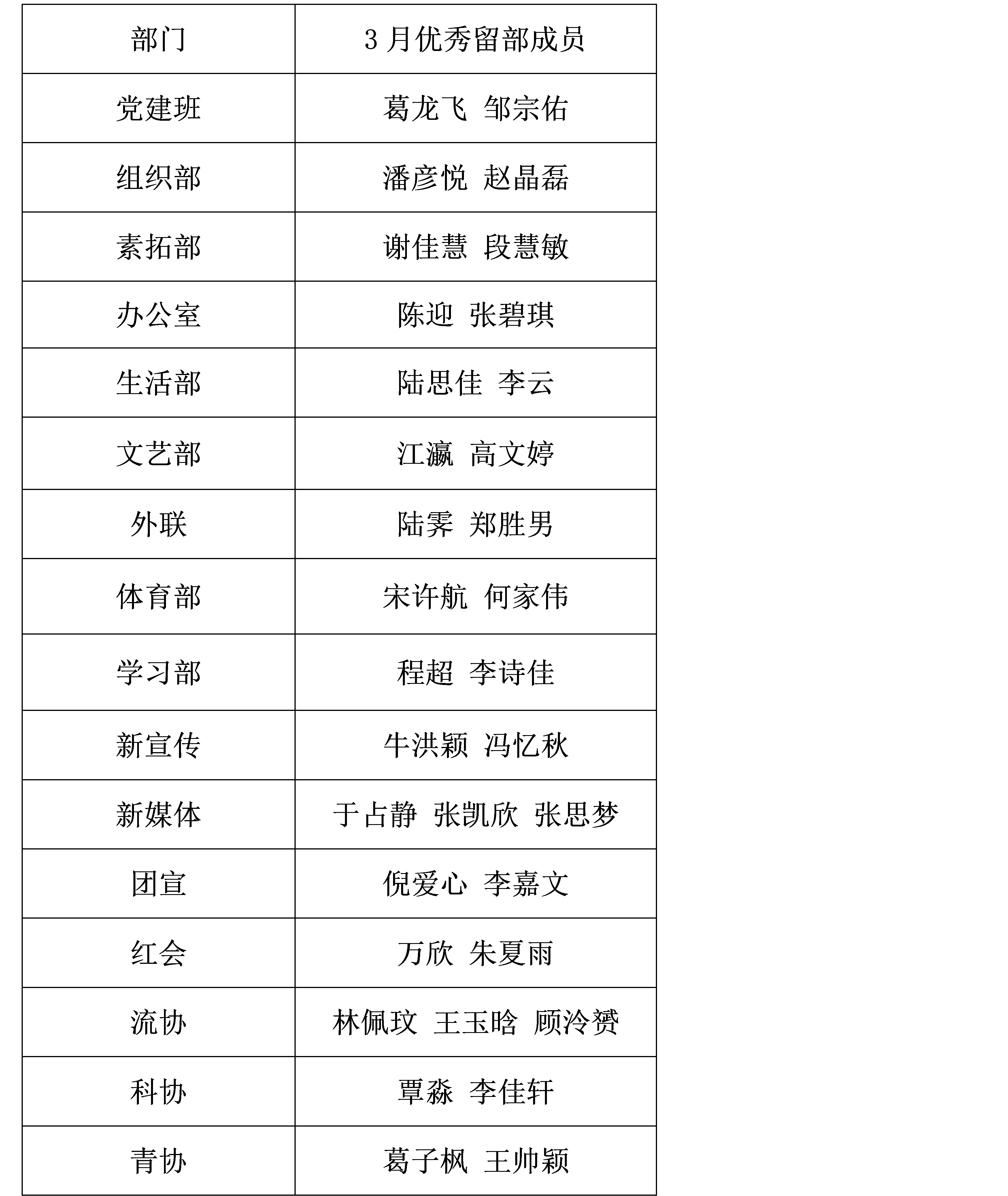 【学生工作】第37届党建班、团委学生会各部门3月留部成员名单公示