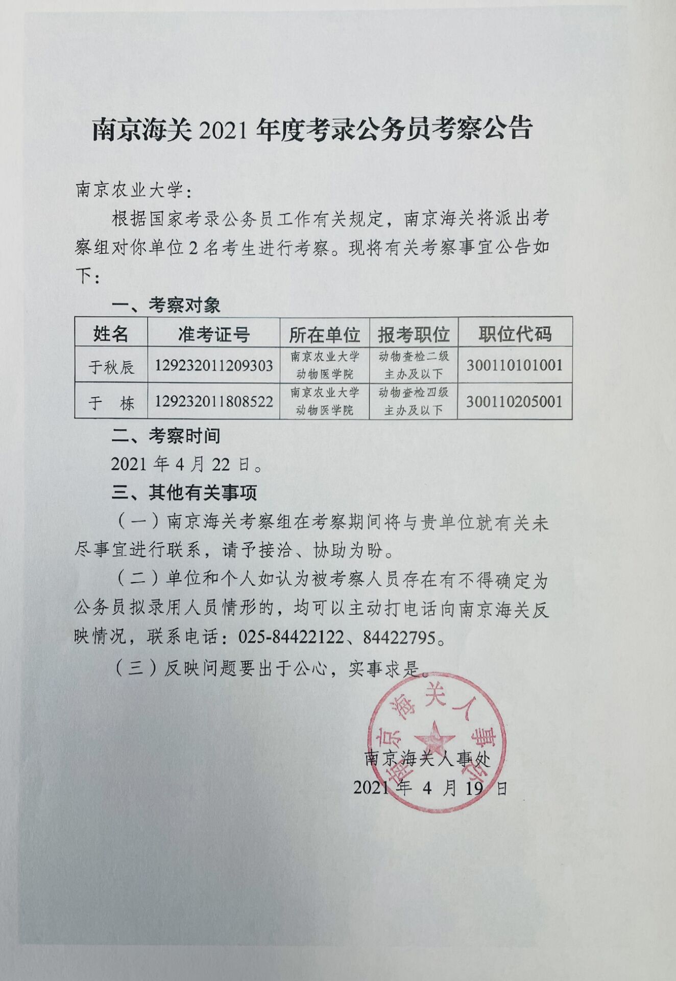 【学生工作】关于于秋辰、于栋考录南京海关公务员的考察公告