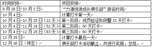 第一阶段(21天打卡):请加入俱乐部的成员,需要完成21天的阅读打卡,每天需要至少阅读30分钟,打卡的具体操作建议为:每人每天阅读之后需要在“力源悦读成长俱乐部”的QQ大群中和自己小组的QQ群中,发表100字左右的“阅读进展及读书心得”(当天晚上22:00前),供大家交流讨论。如因特殊情况需中断(不超过1天)的成员,需上报组长,并经过俱乐部部长同意。本阶段有1天“懈怠时间”。累计2天及以上中断,则需从第1天重新计算,阅读打卡操作参照第一阶段打卡。
