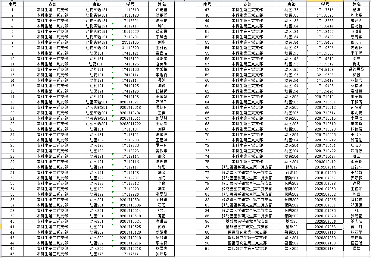 根据学院党员发展工作安排,经由学生自愿申请,各团支部推荐,党支部讨论,结合初级党建班期间个人表现、结业考试成绩等综合情况,经学院党委审核,接收卢与佳等91名本科生和研究生成为入党积极分子,现将名单公示如下:
