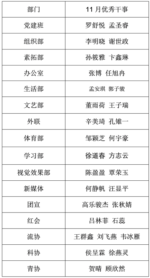 【学生工作】第38届党建班、团委学生会各部门11月优秀干事名单公示
