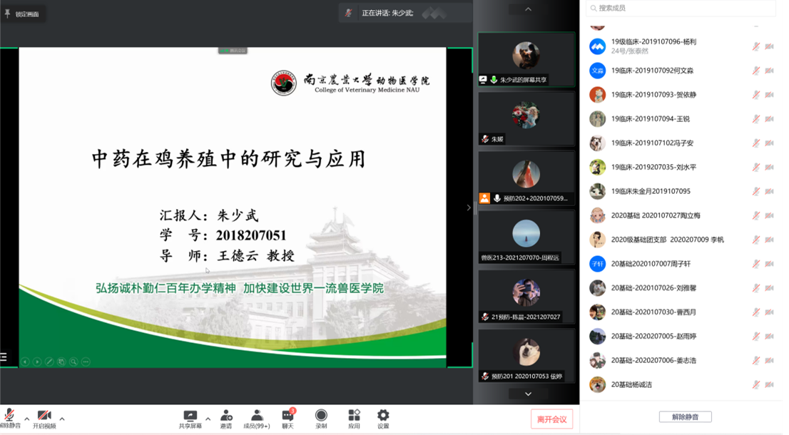 第二位汇报的是来自临床兽医学的朱少武,他汇报的题目是《中药在鸡养殖中的研究与应用》。近年来禁抗条例的颁布使抗生素使用受限,中药具有抗菌,抗炎,抗病毒并进行免疫调节的作用,本研究以蒲公英、野菊花、紫花地丁为原料制备蒲地散并进行体内外研究,说明蒲地散具有一定的抗炎功效和免疫调节功能,可以提高鸡肠道健康水平,减少肠道疾病的发生,从而提高生产效益,因此,蒲地散可开发为鸡用新型饲料添加剂,以替代抗生素在养殖过程中的使用。