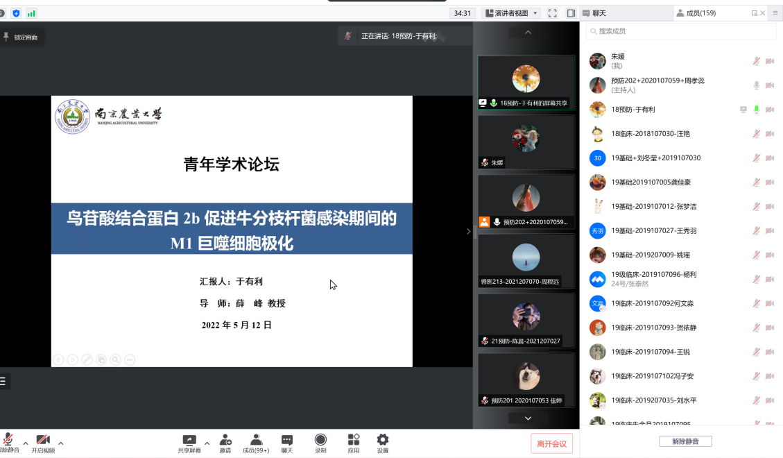 第三位汇报的是来自预防兽医学的于有利,她汇报的题目是《鸟苷酸结合蛋白2b有助于牛分枝杆菌感染期间的M1巨噬细胞极化》。牛分枝杆菌引起的牛结核病对畜牧业和人类造成健康风险和经济损失,鸟苷酸结合蛋白可以调节各种细胞功能,也是促进巨噬细胞炎症反应的蛋白,本研究揭示了巨噬细胞GBP2b基因对牛分枝杆菌感染后巨噬细胞极化和炎性反应的调控作用,对于进一步深入系统研究人畜共患结核病发病机制、预防和靶向治疗提供理论依据。