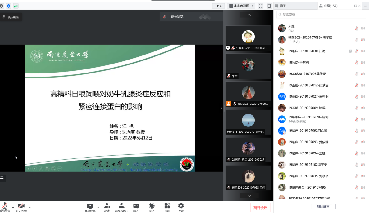 第四位汇报的是来自临床兽医学的汪艳,她汇报的题目是《高精料日粮饲喂对奶牛乳腺炎症反应和紧密连接蛋白的影响》。短期饲喂高精料日粮可以提高生产性能,但是长期大量饲喂会造成瘤胃酸中毒,瘤胃酸中毒时会造成细菌内毒素增多从而导致乳腺炎症反应和紧密连接损伤,本研究发现iE-DAP,通过激活BMECs中NOD1依赖性的NF-κB和NF-κB/ML CK信号通路,诱发炎症反应和紧密连接损伤。