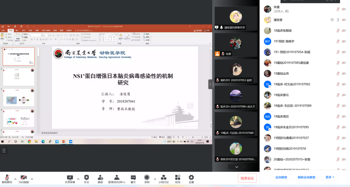 第二位汇报的是来自预防兽医学的潘俊慧,她汇报的题目是《日本脑炎病毒NS1蛋白增强病毒感染机制探究》。流行性乙型脑炎是日本脑炎病毒引起的人畜共患病,NS1蛋白是JEV的一个非结构蛋白,NS1’蛋白是NS1蛋白的衍生物,本研究探究NS1’蛋白在JEV感染过程中的生物学功能并揭示对JEV传播的分子机制,从而为新型疫苗和抗病毒药物的研制提供新思路。