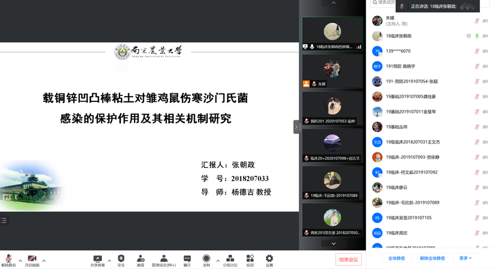 第四位汇报的是来自临床兽医学的张朝政,他汇报的题目是《载铜锌凹凸棒黏土对雏鸡鼠伤寒沙门氏菌感染的保护作用及其相关机制研究》。鼠伤寒沙门氏菌感染家禽导致其厌食、畏寒、腹泻和呼吸困难等症状,造成巨大经济损失,目前,虽然抗生素、疫苗、抗菌肽、益生菌等产品用于市场,但是它们有一定的使用局限性,因此需要研制一种新型抗菌剂用于防治鼠伤寒沙门氏菌的感染。本试验制备载铜锌凹凸棒粘土(Cu/Zn-Pal),探究其对雏鸡免受鼠伤寒沙门氏菊感染的保护作用和相关机制研究,从而将CuZn-Pal作为一种绿色、安全、高效的新型抗菌剂使用。