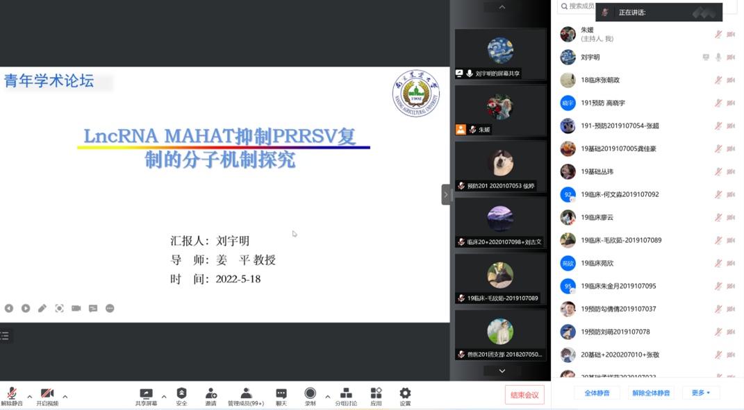 第三位汇报的是来自预防兽医学的刘宇明,他汇报的题目是《LncRNA-MAHAT抑制PRRSV复制的分子机制探究》。猪繁殖与呼吸综合征病毒(PRRSV)能引起妊娠母猪流产、早产,仔猪成活率下降,育肥猪生长缓慢,造成巨大经济损失,目前在宿主蛋白、天然抗病毒药物与microRNA等方面抑制PRRSV复制的相关研究中已经取得大量重要进展,但PRRSV的免疫逃避机制是目前猪病防治领域研究的热点与难点,长链非编码RNA(LncRNA)在生物学进程中扮演极其重要的角色,对基因转录、细胞功能与免疫反应等都有明显的调控作用,已有大量研究表明lncRNA在宿主免疫作用以及抗病毒反应方面有重要的功能。本研究深入探究其作用机制以及PRRSV引起免疫抑制机制的原因。