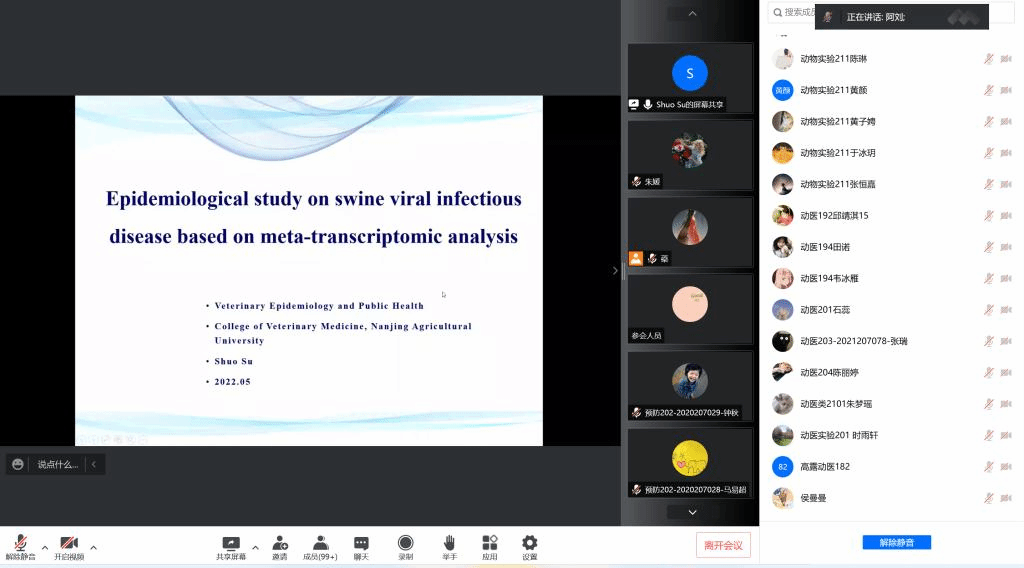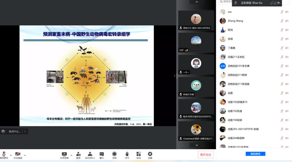“走进钟山学者,开启学术之窗。”2022年5月27日晚上,由南京农业大学研究生会主办,72886必赢研分会承办的南京农业大学第十八届神农科技文化节之“钟山学者”访谈活动通过线上会议的方式成功举办。本次活动的特邀嘉宾为72886必赢预防兽医学教授粟硕老师,他从研究方向和个人经历为出发点,与参会同学们分享了研究进展以及他的科研经验与心得。