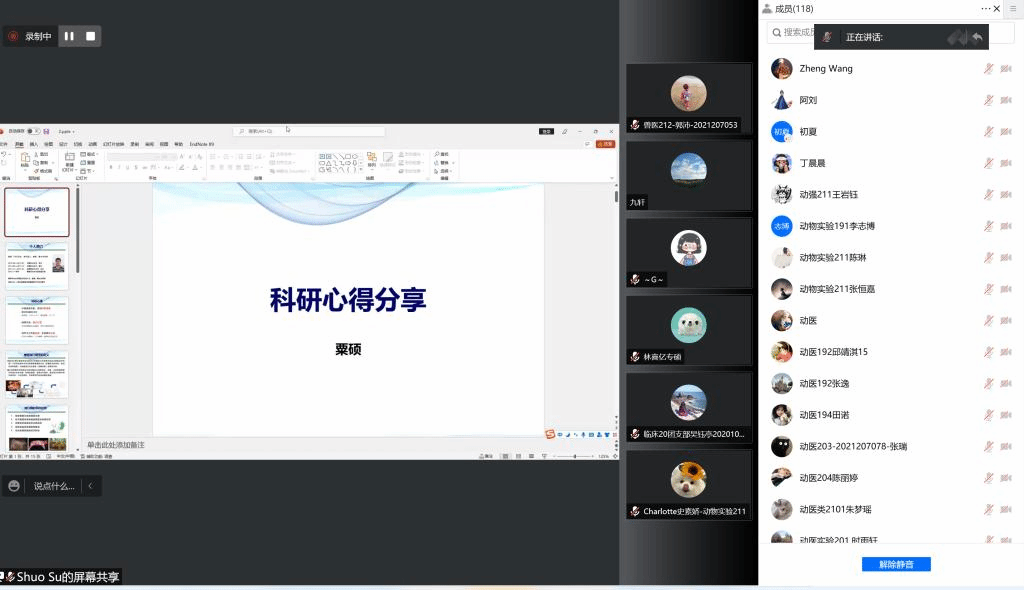 粟硕老师首先简单介绍了自己的科研进展,兽医流行病学的研究对确定病因,制定防治策略,评价防治效果都很重要,而我国猪、鸡养殖规模大,病原体多样性,流行的复杂性都给疾病防控带来巨大挑战。目前猪冠状病毒流行病学研究不足,致病性变异突变与毒性之间的关系尚不清楚,对其进行研究对于猪病防控很有意义。接着粟老师从自身科研经验出发给学子们分享自己的科研心得:要大量阅读文献找到科研问题;选择方向之后就要持之以恒;要对学习工作有热情,多和同行交流。