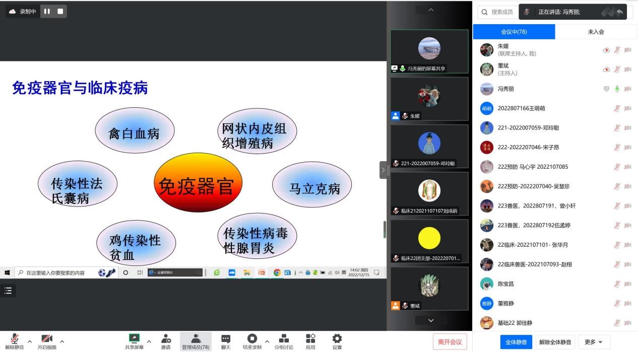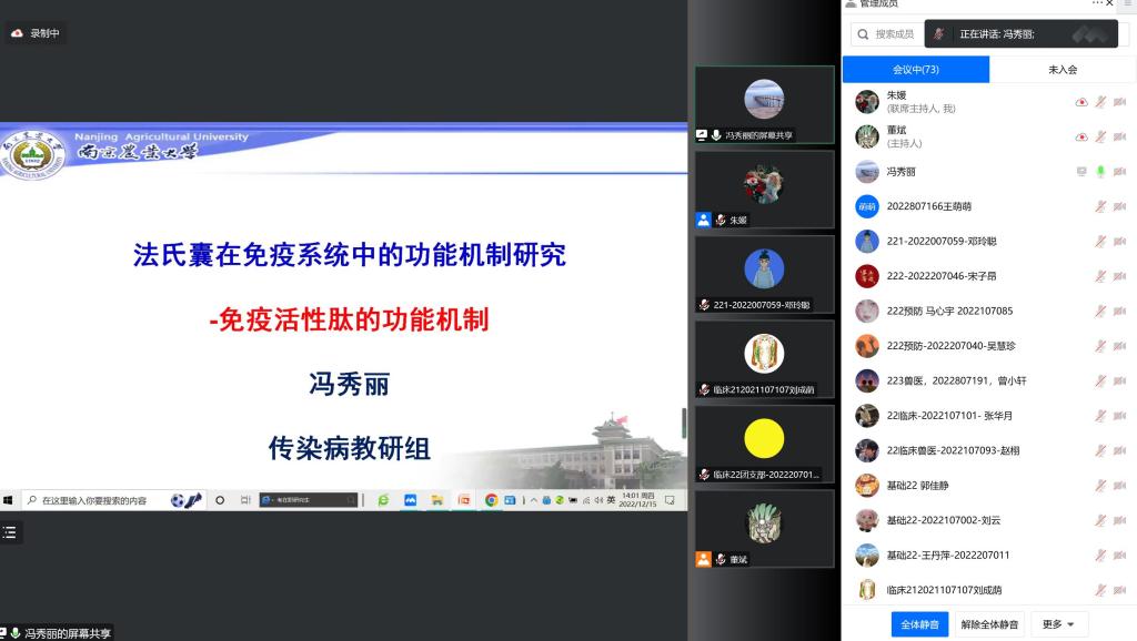 “走进钟山学者,开启学术之窗。”2022年12月15日下午,由南京农业大学研究生会主办,72886必赢研究生会分会承办的南京农业大学第十九届神农科技文化节之“钟山学者(新秀)”访谈活动通过线上会议的方式成功举办。本次活动的特邀嘉宾为72886必赢预防兽医学教授冯秀丽老师,她从研究方向和个人经历为出发点,与参会同学们分享了研究进展以及她的科研经验与心得。