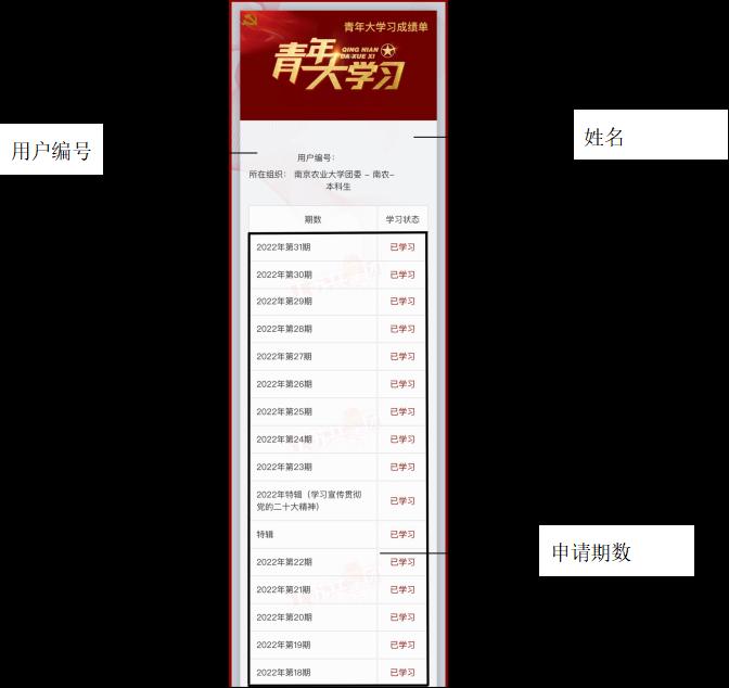 申请学时的学生将青年大学习成绩单命名方式为——“用户编号-姓名-学号-申请学时数量”,并需在成绩单中用方框标出申请学时的对应期数(如图1所示)交至所在二级团组织。