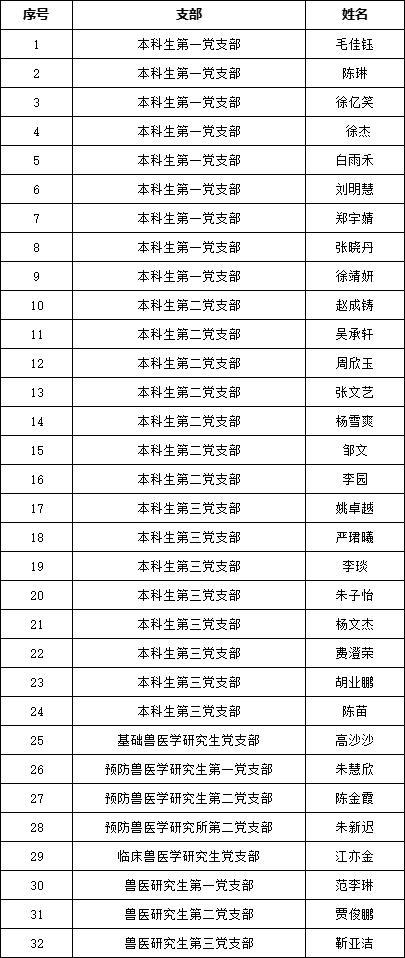 根据学院党员发展工作安排,经党组织培养考察,党支部讨论,结合入党积极分子期间个人表现、结业考试成绩等综合情况,经学院党委审核,接收毛佳钰等32名同志为发展对象,现将名单公示如下(排名不分先后):